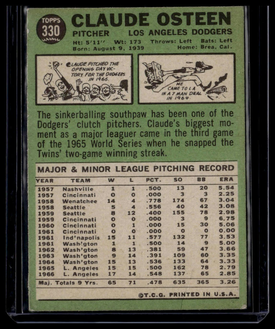 You are purchasing a 1967 Topps Claude Osteen #330. You will receive the exact card in the photographs. Thank you for looking. Listed With Mascot.