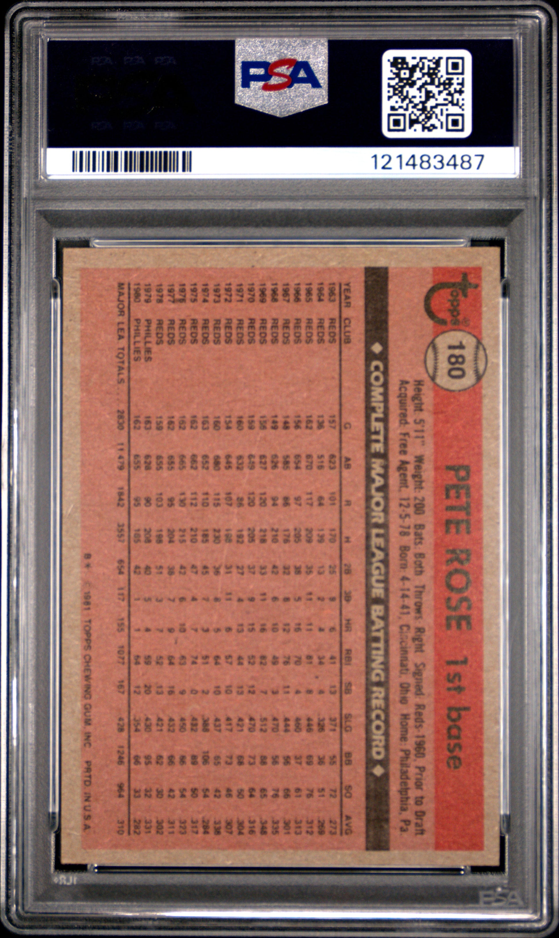 Thank you for your interest in purchasing the 1981 Topps Pete Rose #180 PSA 3. Please note that the exact item shown in the photographs will be the one you receive. We appreciate you considering Windy City Sports Cards to help you expand your collection. As fellow collectors ourselves, we understand the passion for sports cards. Listed With Mascot.