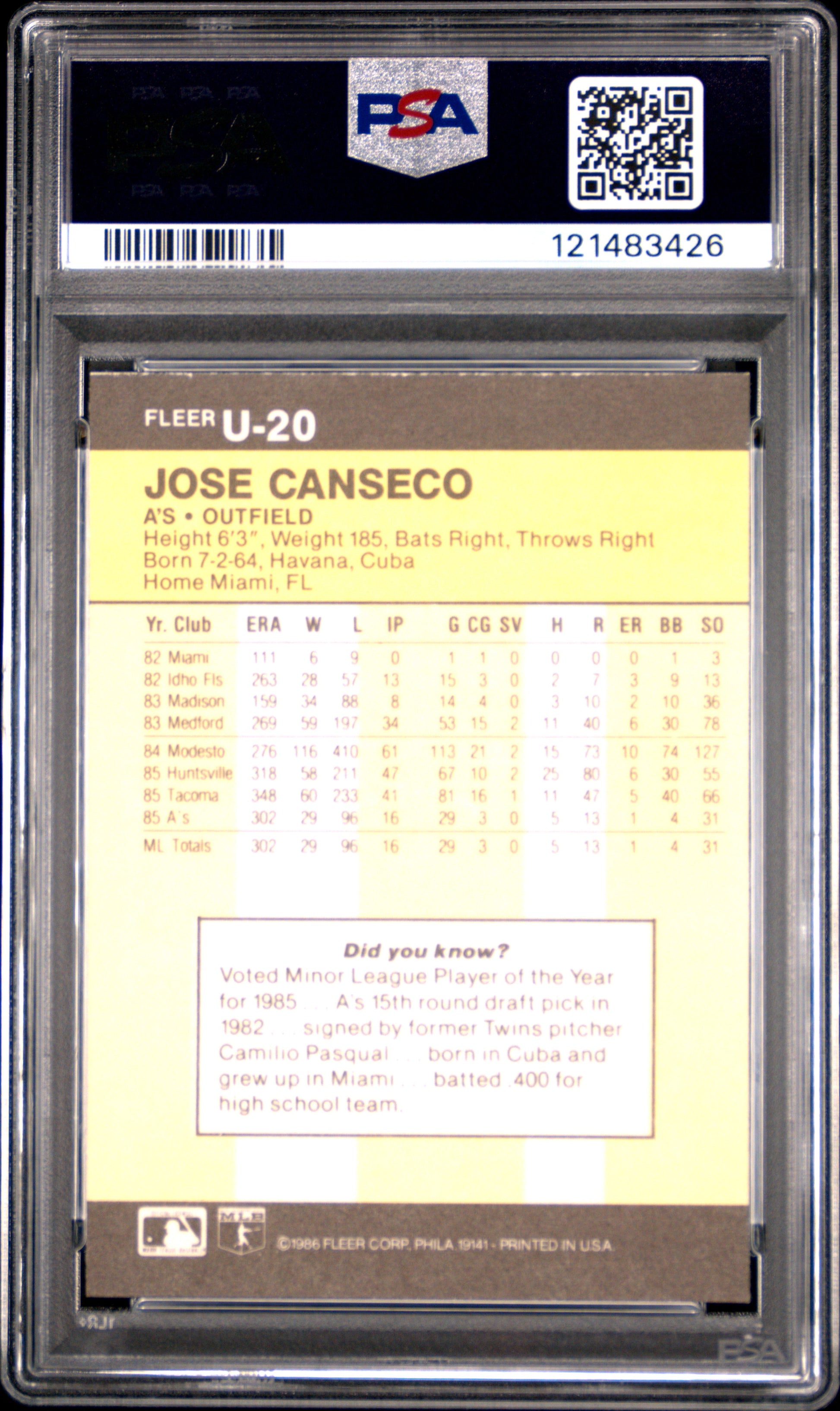 Thank you for your interest in purchasing the 1986 Fleer Update Jose Canseco #U-20 PSA 8. Please note that the exact item shown in the photographs will be the one you receive. We appreciate you considering Windy City Sports Cards to help you expand your collection. As fellow collectors ourselves, we understand the passion for sports cards. Listed With Mascot.