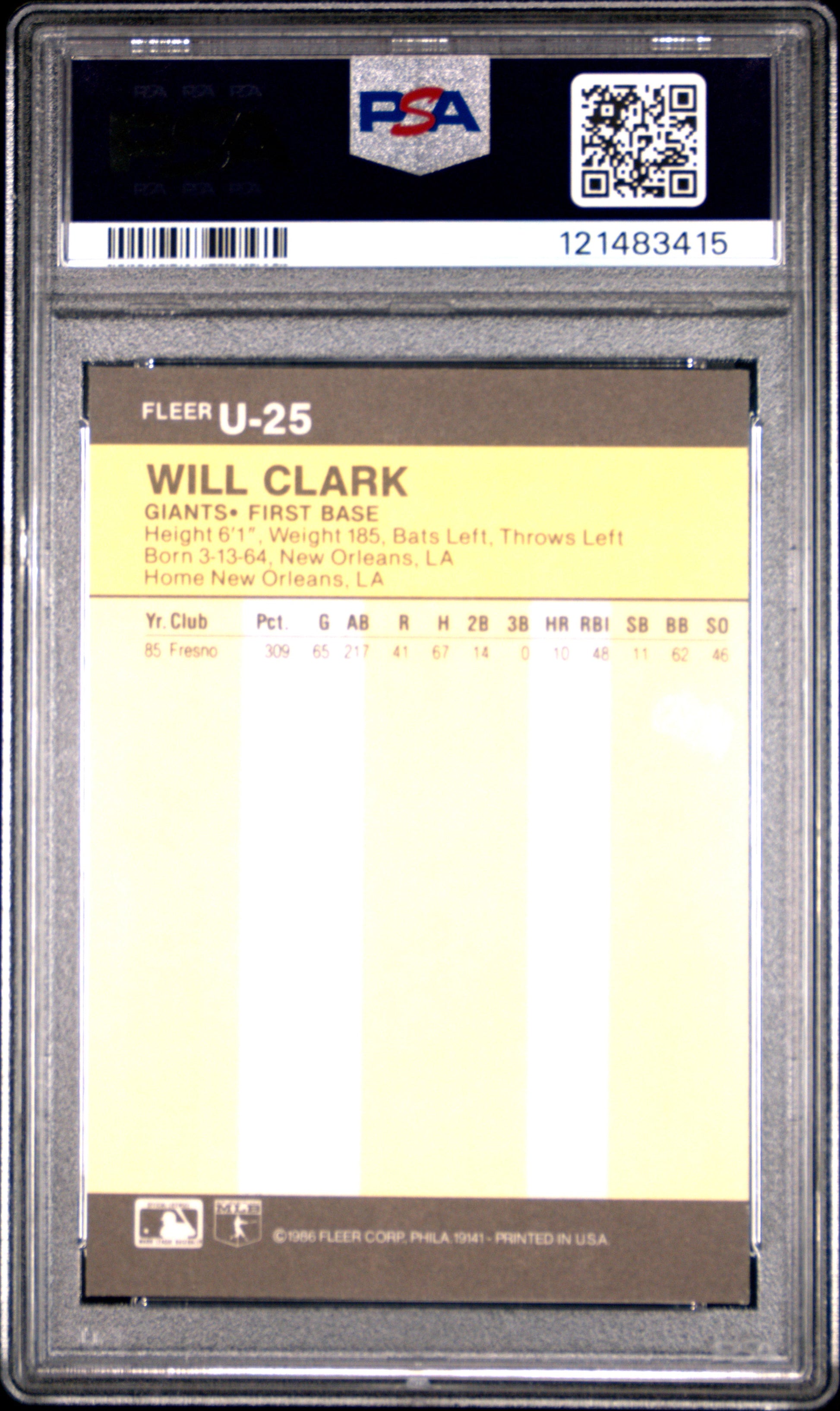 Thank you for your interest in purchasing the 1986 Fleer Update Will Clark #U-25 PSA 8. Please note that the exact item shown in the photographs will be the one you receive. We appreciate you considering Windy City Sports Cards to help you expand your collection. As fellow collectors ourselves, we understand the passion for sports cards. Listed With Mascot.