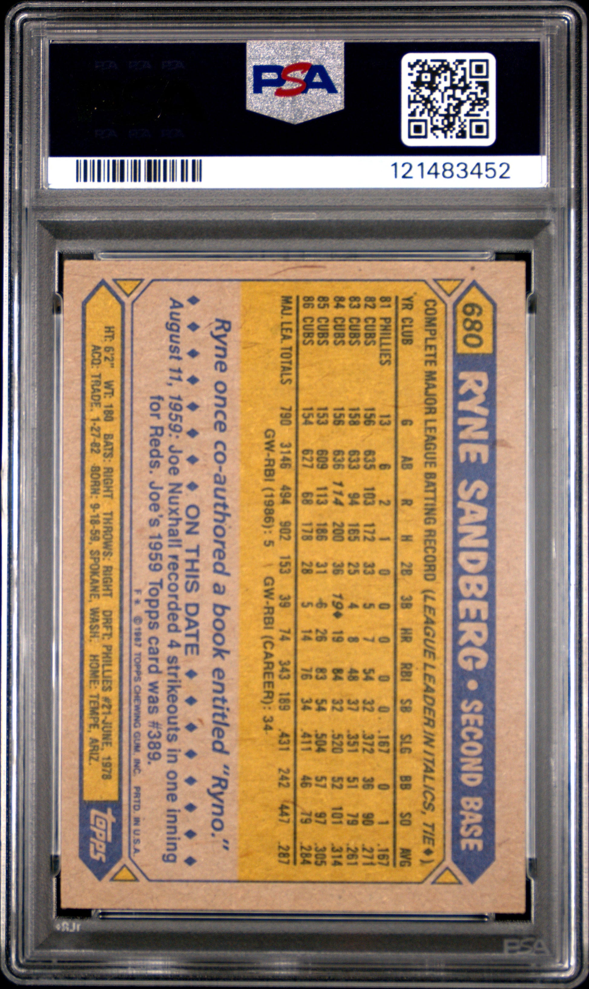 Thank you for your interest in purchasing the 1987 Topps Ryne Sandberg #680 PSA 6. Please note that the exact item shown in the photographs will be the one you receive. We appreciate you considering Windy City Sports Cards to help you expand your collection. As fellow collectors ourselves, we understand the passion for sports cards. Listed With Mascot.