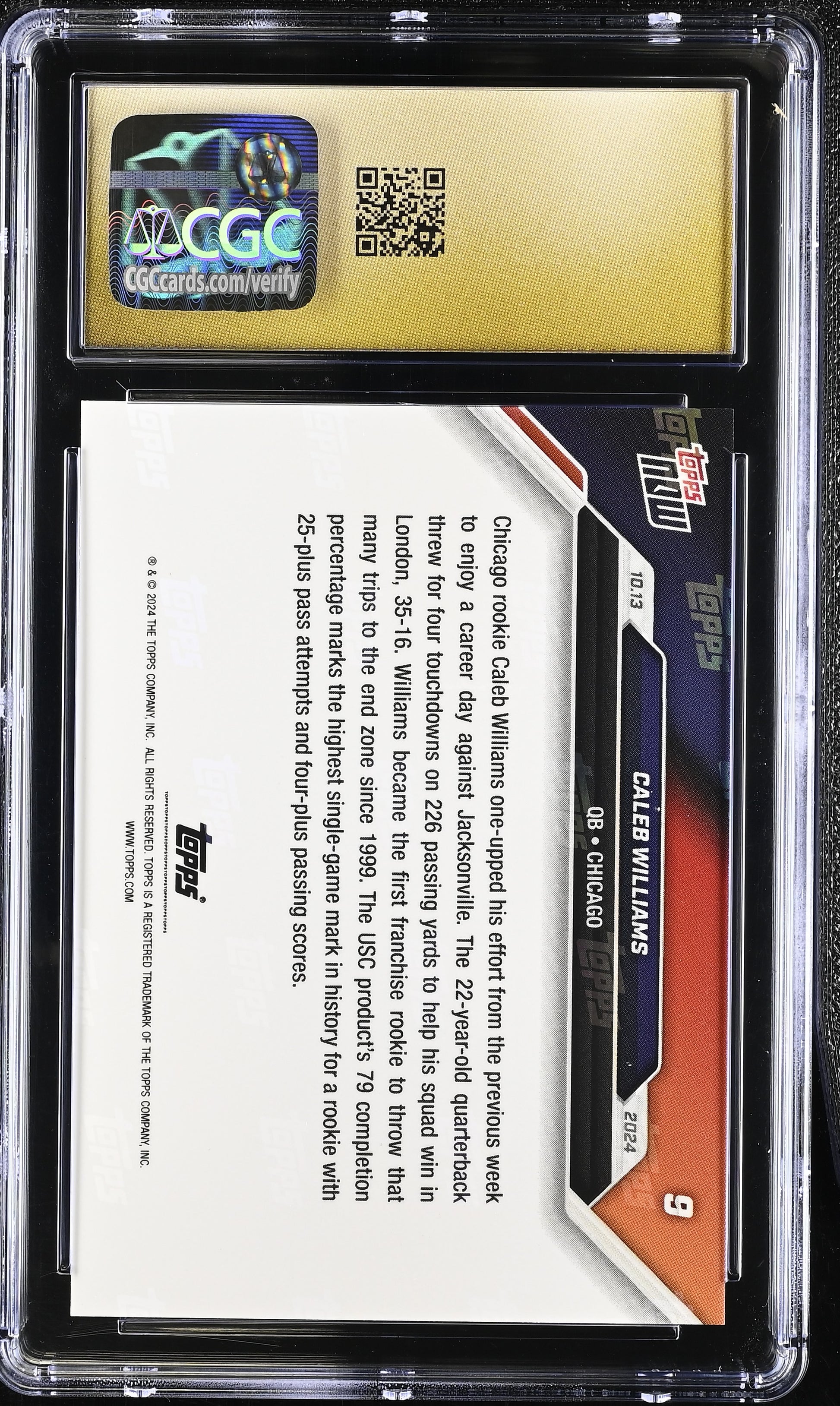Thank you for your interest in purchasing the 2024 Topps Now Caleb Williams #9 CGC 10. Please note that the exact item shown in the photographs will be the one you receive. We appreciate you considering Windy City Sports Cards to help you expand your collection. As fellow collectors ourselves, we understand the passion for sports cards. Listed With Mascot.